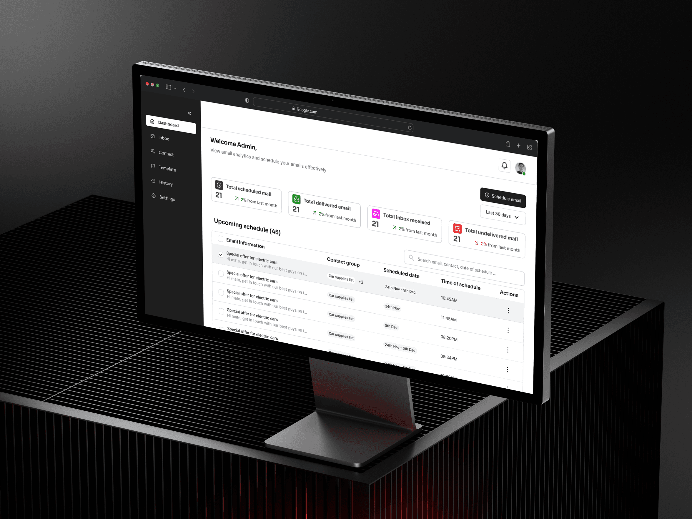 Schedule email, create template and manage clients contacts