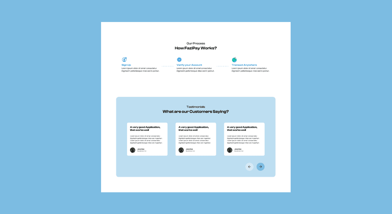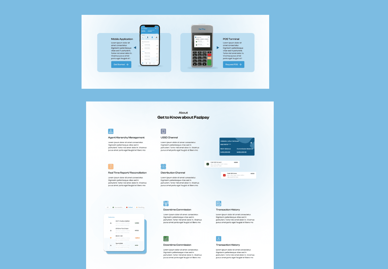 Engagement and Conversion: Design sections that explain how to get started with Fazipay and highlight the benefits of using the platform for financial transactions.